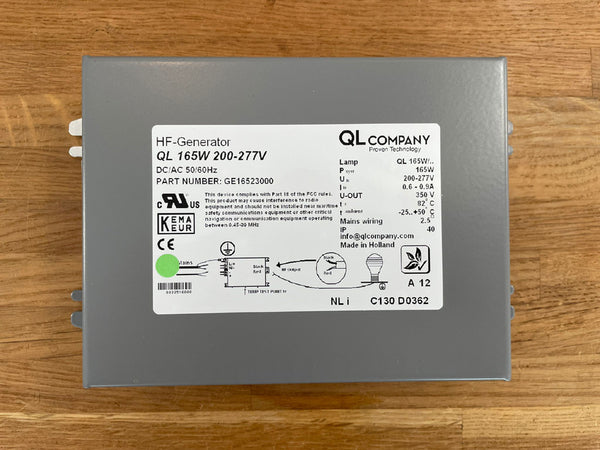 HF-GeneratorQL 165W 200-277VQL COMPANYDC/AC 50/60HzPART NUMBER: GE16523000QL 165W driver voorschakelapparaat