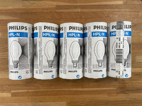 Vintage NOS HPL lampen van Philips in een ongebruikte, fabrieksnieuwe staat in de originele verpakking. Authentieke HPL lampen van goede kwaliteit.