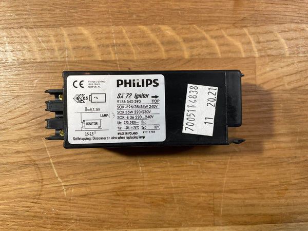 SX 72 220-240V 50/60HzOrder code: 913654059066Full product code: 871150091561030EAN/UPC - Product 8711500915610HID ignitors for series systemsPhilips SX72 ontsteker voor SOX-E 26W, SOX-E 36W, SOX 35W en SOX 55WPhilips SX 72 Ignitor 9136540590